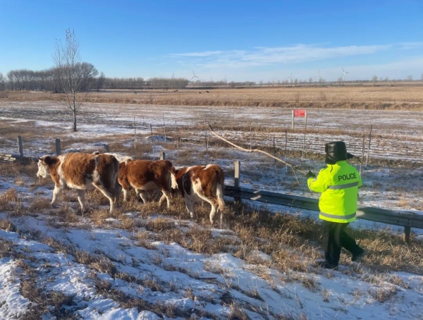 12月14日,吉林高速公安白城分局巡逻一大队在辖区巡逻时,发现有牛群正在高速公路边沟“散步”,经过民辅警妥善处理成功消除一起安全隐患。