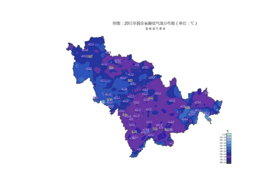 受强冷空气影响,20日早晨,吉林省全省大部最低气温为-28~-23℃,南部部分地方低于-30℃。