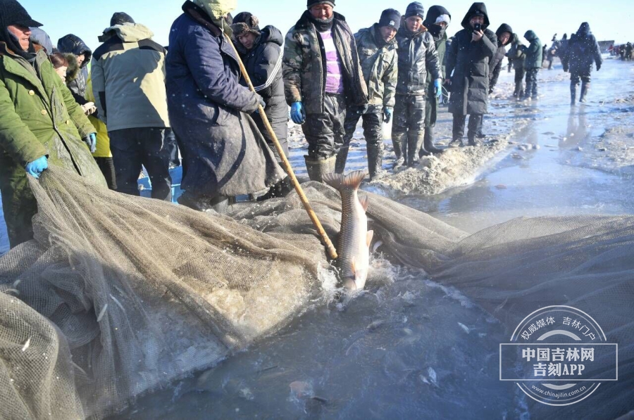 查干湖冬捕是“吉林八景”之一,被誉为“冰湖腾鱼”。这是一项可以追溯到辽金时代的盛事。据说当年的辽帝圣宗喜欢吃“冰鱼”。每年腊月,他便率领家眷浩浩荡荡到冰冻的查干湖面上扎营,命令仆从将帐篷里的冰层刮薄,直到刮到薄弱纸片,冰河游鱼清晰可见。等到老少皆大欢喜,看够了游鱼嬉戏,便将薄冰轻轻击破,将水中鲜活的游鱼用工具捕捞出水,大快朵颐。