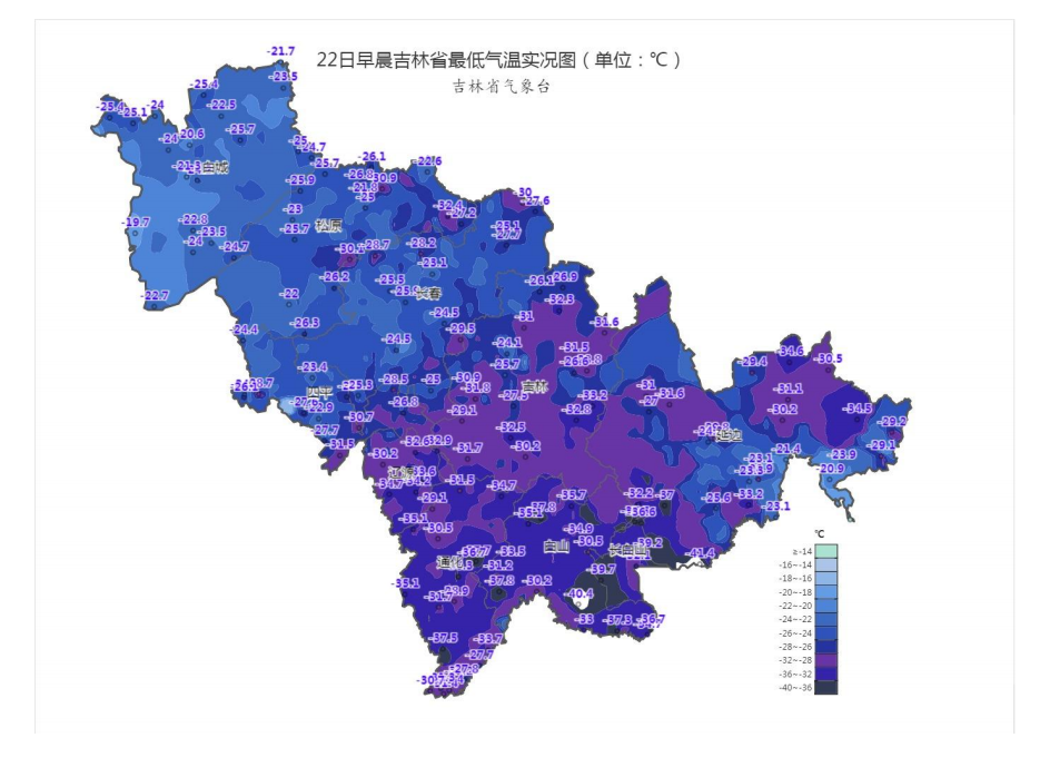 22日白天白城地区最高气温为-11℃左右,其他地区-17~-13℃;夜间全省大部分地区最低气温为-24~-18℃,其中东南部山区部分地方可达-30℃以下。