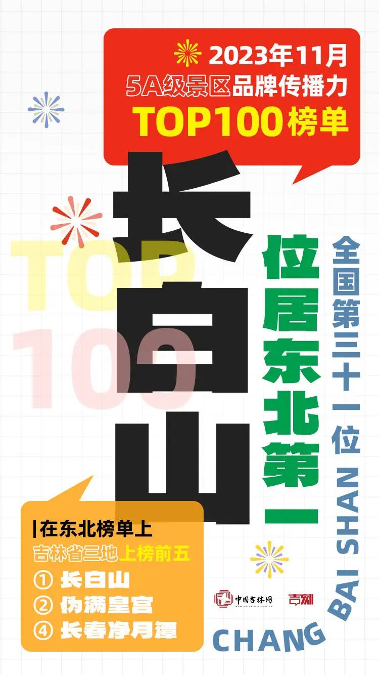 近日,迈点研究院发布2023年11月5A级景区品牌传播力100强榜单,长白山位居东北第一。