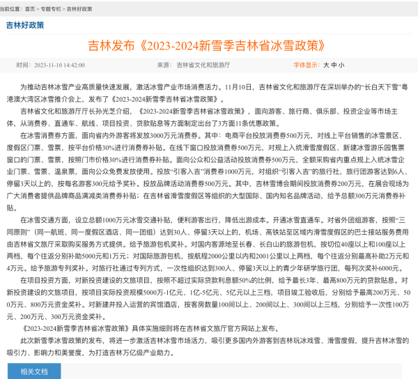 早在11月10日,吉林省文化和旅游厅在深圳举办的“长白天下雪”粤港澳大湾区冰雪推介会上,就发布了《2023-2024新雪季吉林省冰雪政策》。