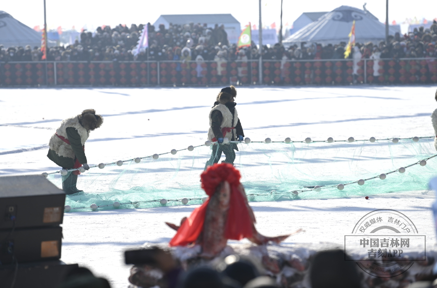 祭湖·醒网仪式上,祭湖词响彻天地,萨满舞祈福丰收,渔把头将烈酒洒向沉睡的渔网,古老神秘的祭湖·醒网仪式讲述着跨越千年的传奇,追溯着查干湖冬捕历史的脉络。马蹄踏过厚实的冰层,千米巨网被缓缓拉出水面,万尾鲜鱼跃起迸溅着水花,在广阔的冰面上堆成一座座“鱼山”,“年年有鱼”的丰收喜悦让现场热“雪”沸腾。