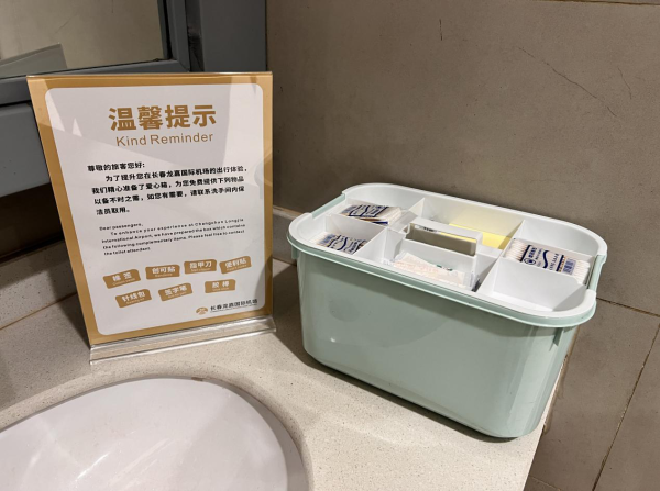 为完善卫生间服务设施,打造便民服务“综合体”,长春机场在T2航站楼卫生间推出便民爱心服务,配备了便民服务箱,箱内放有棉签、创可贴、指甲刀、针线包、签字笔、胶棒、便利贴等物品,在各卫生间内设有醒目温馨的提示牌,提示旅客需要时可以联系洗手间内保洁员取用,逐步打造洁净温馨、功能完备、服务到位的精品卫生间。