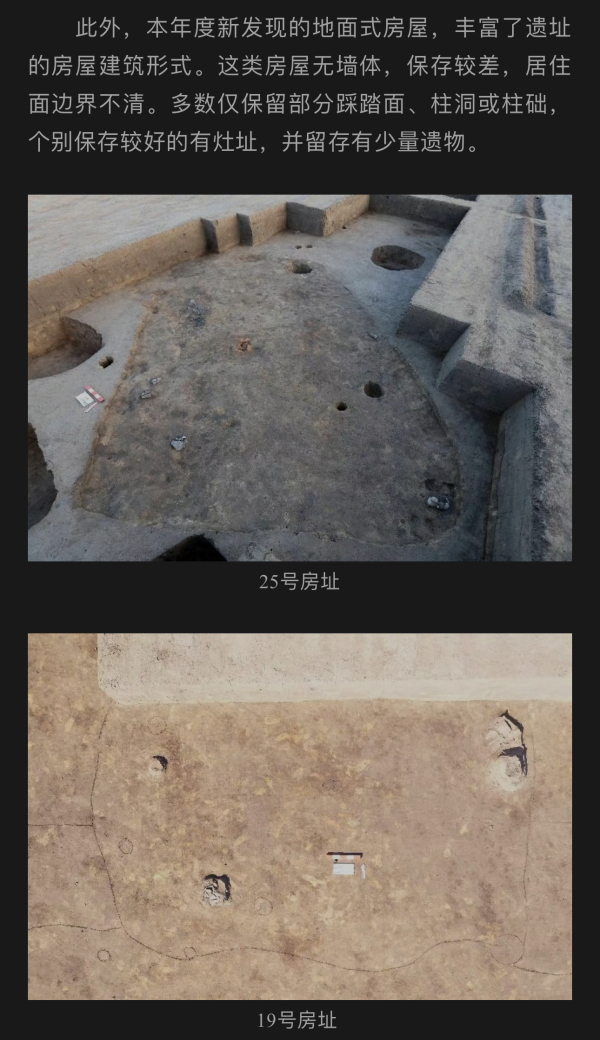 大量房屋的发现是本年度的重要收获。房屋以圆角方形或圆角长方形半地穴式为主,面积20~60平方米不等。屋内普遍有灶、柱洞、窖穴等附属遗迹,均不见门道,多数房屋居住面留存遗物较少。