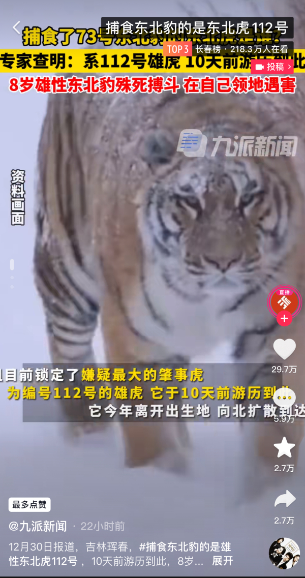 最近,在吉林珲春,发生了一起非常罕见的东北虎捕食东北豹事件。事件发生的当天,就受到了网友的关注并登上了热搜。