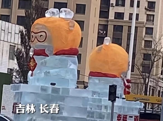 长春的冰雕戴上了砂糖橘的小帽子