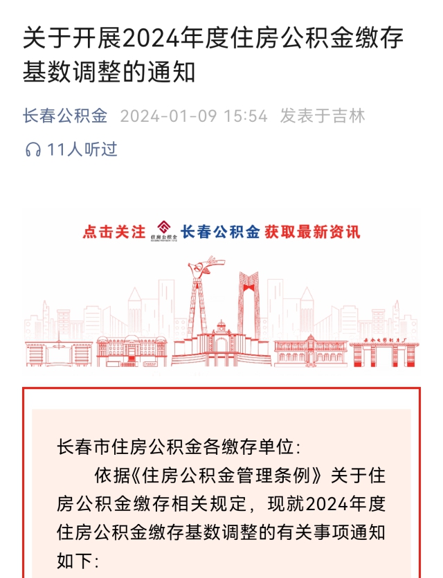 中国吉林网获悉,2024年度,长春市住房公积金缴存基数有所调整。
