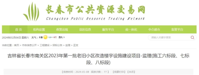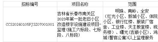 中国吉林网获悉,近日,长春市公共资源交易网发布《吉林省长春市南关区2023年第一批老旧小区改造楼宇设施建设项目-监理(施工六标段、七标段、八标段)招标公告》。