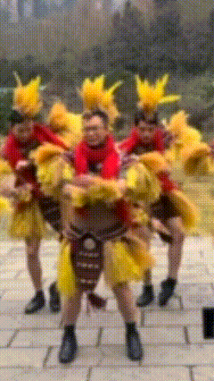 张家界武陵源区文旅局长彭振华与魅力湘西的演员一起,在湖南张家界武陵源景区(张家界国家森林公园)身穿土家族民族服饰变身“茅古斯”合跳“科目三”,为当地旅游揽客。