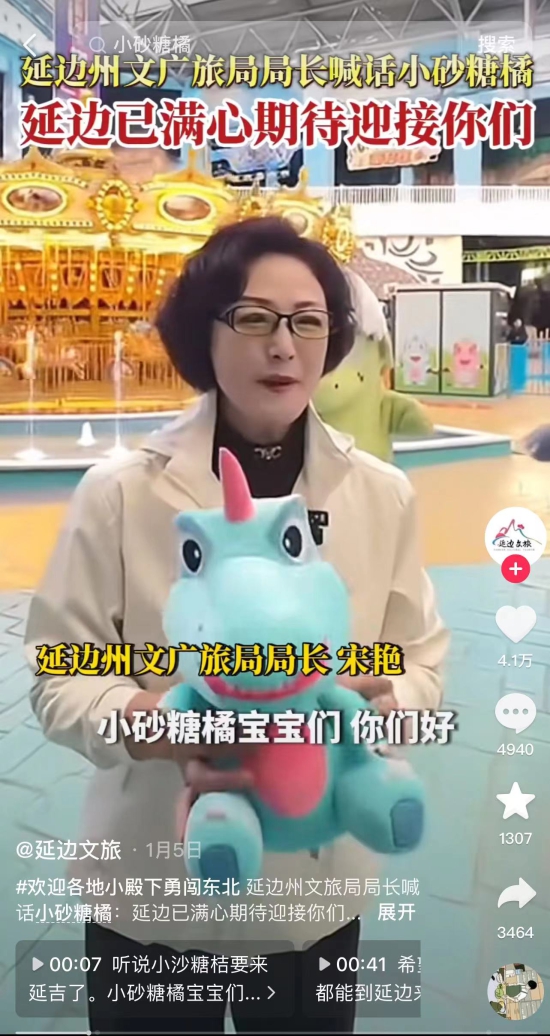 吉林省延边州文旅局局长也热情地喊话小砂糖橘:我们会带你们到恐龙王国看海豚表演、到民宿园来一次穿越之旅、在延边的布尔哈通河上都是你们喜欢的冰雪项目,还有美味的烤肉、烤串、米糕在等待着你们哦!