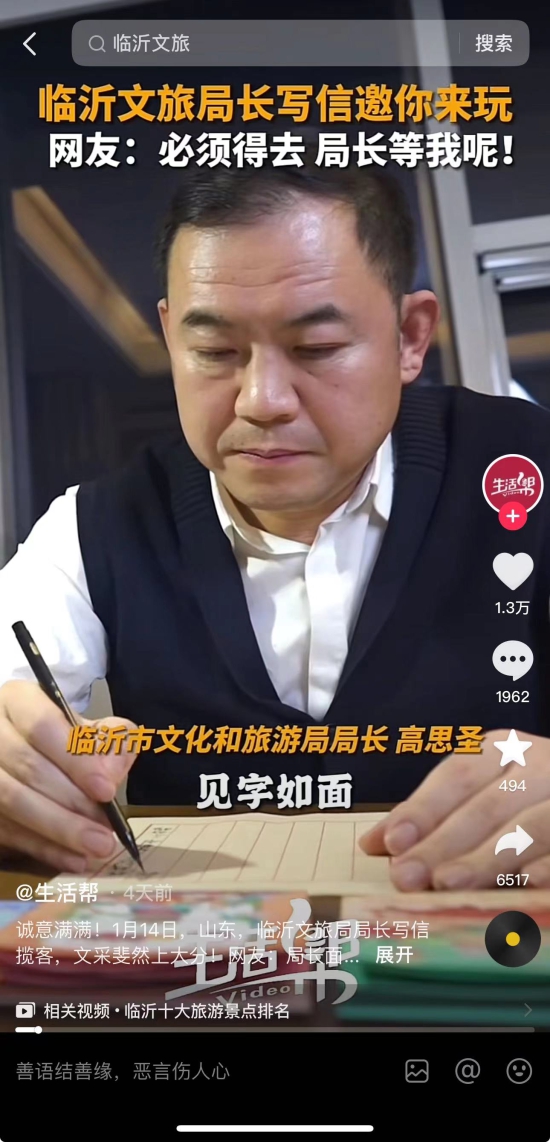 除了各种变装大秀,还有文采展示,山东临沂文旅局局长高思圣以手写毛笔字的方式宣传旅游,洋洋洒洒的信件一出,被网友评为“走心了”。