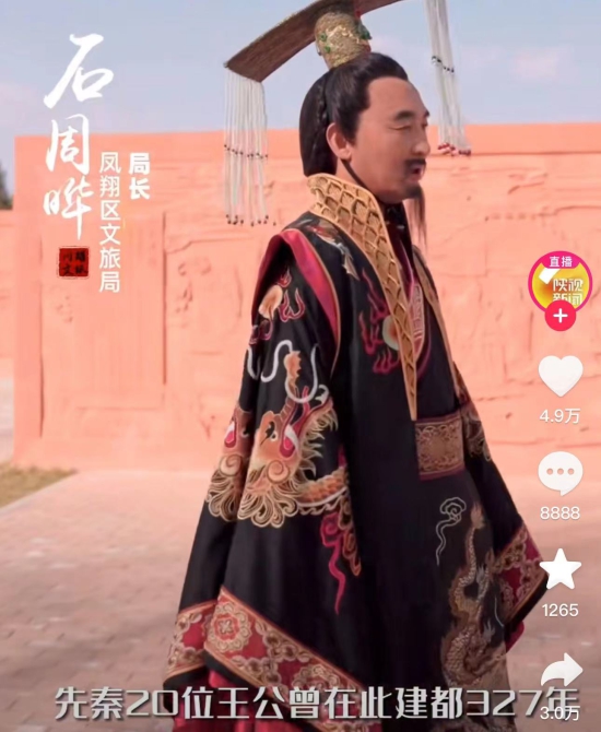 陕西省宝鸡市凤翔区文旅局局长石周晔扮演秦始皇,推荐秦公一号大墓、凤翔东湖等景区。