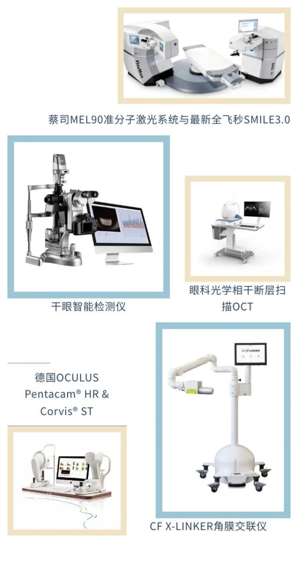 科室主任王淑荣表示,眼科视光中心对标国际一流,拥有国际先进诊疗设备,其中包括新一代的蔡司全飞秒激光设备、准分子激光设备、眼科光学相干断层扫描OCT、眼前节分析仪、综合验光仪、干眼智能检测仪等全套眼科设备,为精准高效开展眼科诊疗提供硬件支撑。