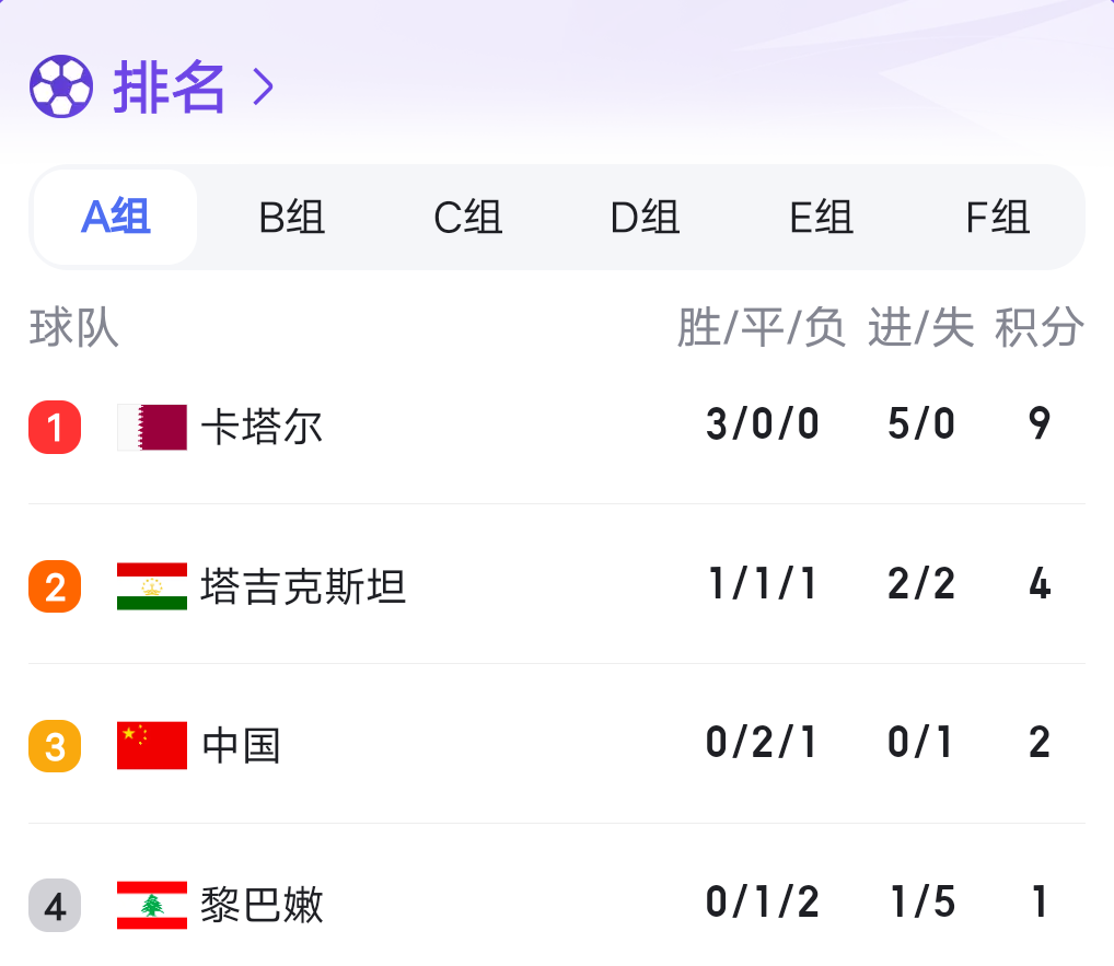 1月23日凌晨,卡塔尔亚洲杯小组生死战中,国足0:1不敌卡塔尔队。三场小组赛,国足战绩为两平一负,一球未进。同组另外一场比赛,塔吉克斯坦队2:1逆转黎巴嫩队,以小组第二身份出线。