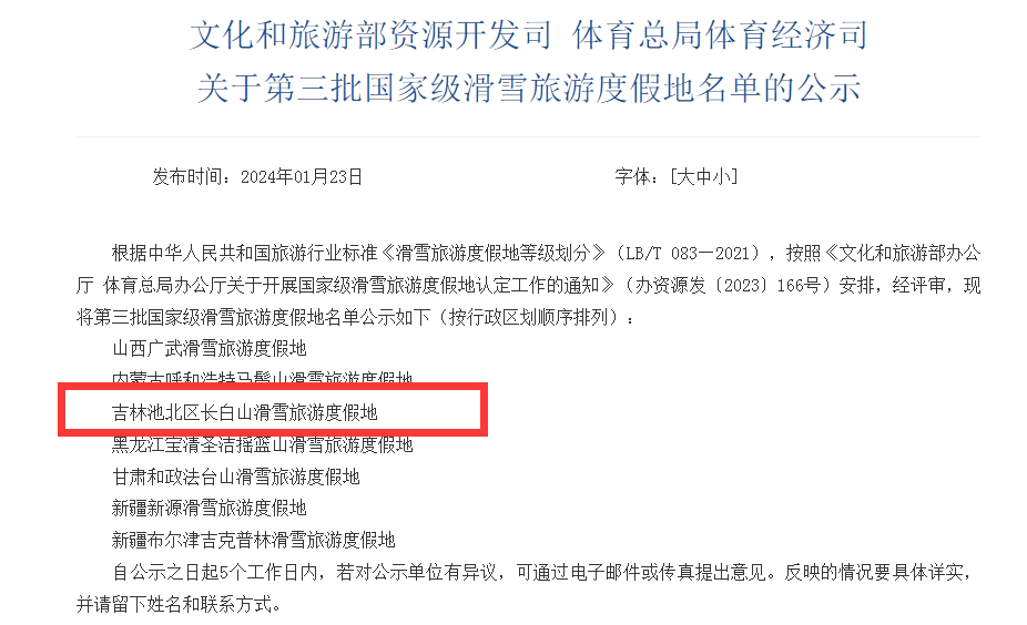 1月23日,文化和旅游部资源开发司、体育总局体育经济司发布“关于第三批国家级滑雪旅游度假地名单的公示”,吉林池北区长白山滑雪旅游度假地在列,这是吉林省第五家进入“国家级滑雪旅游度假地名单”的雪场。