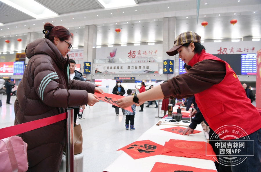 突出“龙行龘龘、祥和团圆”主题,在候车室、售票室悬挂灯笼、中国结等装饰物,结合龙年以及冰雪旅游元素,设置“新春祝福板”“网红打卡地”,营造节日氛围。春运首日,长春站联合民航、公路、轨道交通、公交等交通运输企业开展“你我手牵手 共建平安回家路”主题活动。在活动现场发布《“春运有我”承诺书》,制作条幅、展板,开展承诺签名活动。吉林省文化馆在春运首日(1月26日)、小年(2月2日)在长春站候车室举办文艺演出活动,组织书画家挥毫泼墨,为旅客新春送“福”,烘托节日气氛;车站组织工作人员为现场旅客拍照,并赠送照片留念,让旅客带上最美好的祝愿踏上回家的列车。除夕夜,为候车旅客送上热气腾腾的饺子,车站工作人员将和旅客共同欢度春节。