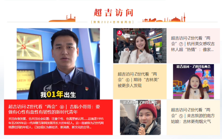 两会召开之际,聚焦普通市民的关心关切,中国吉林网推出了“超吉访问·Z世代看‘两会’”,聚焦年轻群体,以街访的形式,倾听他们的心声,系列视频推出后,受到众多网友点赞。
