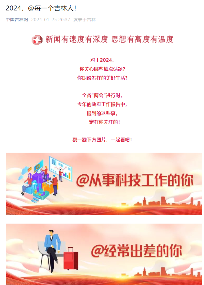 “音频海报·履职建言2024”“2024吉林两会·热看新吉林”“2024吉林两会•人大代表说”“2024吉林两会·越明赴会”等一系列栏目的推出,以影像代替文字,突出时效性,灵活而直接的叙事风格,极大提升了新闻内容的传播度和影响力。
