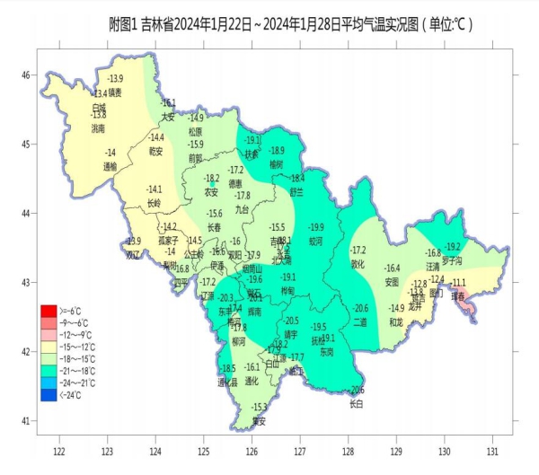 我省气温偏低。全省平均气温-18.7℃,较常年低3.8℃。 各地区较常年低0.2℃~6.2℃。