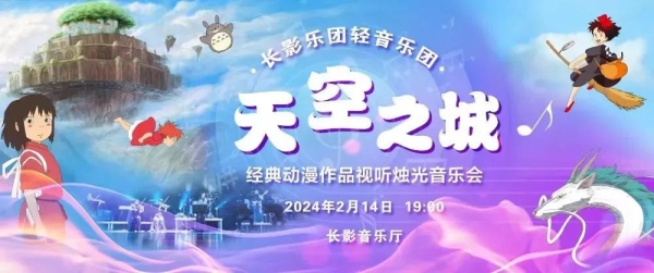 2月14日(大年初五)19:00,长影乐团轻音乐团“天空之城”,经典动漫作品视听烛光音乐会,将在长影音乐厅上演。
