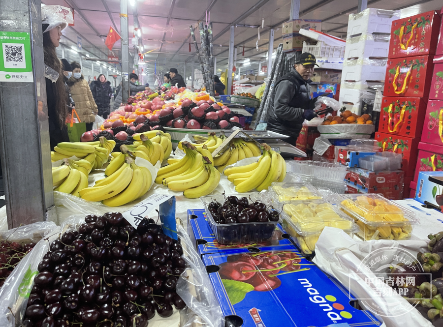 挨着对联和福字的摊位,再往前走走就是室内区域了。南方的、北方的、外地的、本土的各式水果,五颜六色,品类相当丰富。
