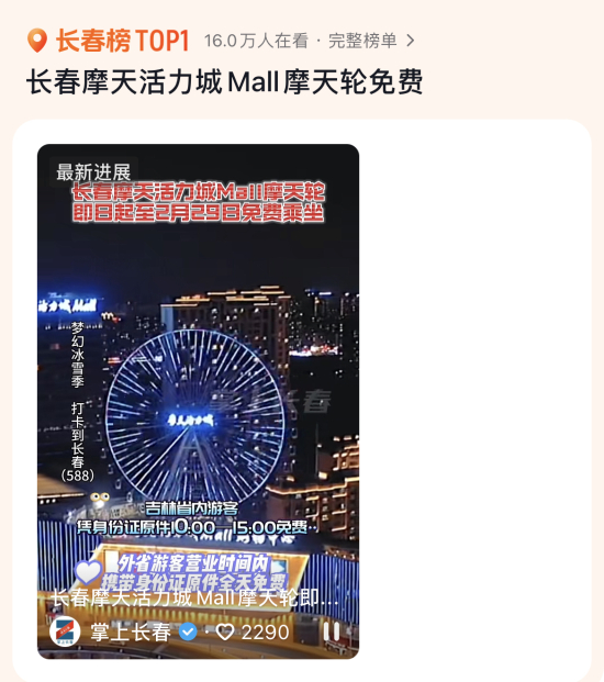 为了欢迎各地游客打卡,即日起至2月29日,凭外省本人身份证即可免费乘坐摩天轮。吉林省内游客凭身份证原件10:00—15:00免费乘坐。