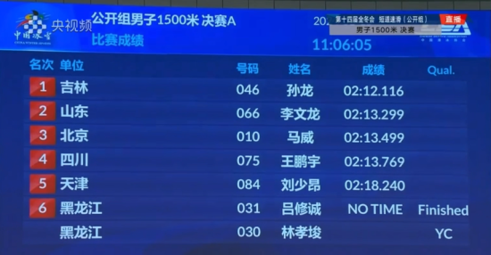 2月16日,第十四届全国冬季运动会短道速滑男子公开组1500米比赛在内蒙古冰上运动训练中心短道速滑馆精彩开赛。