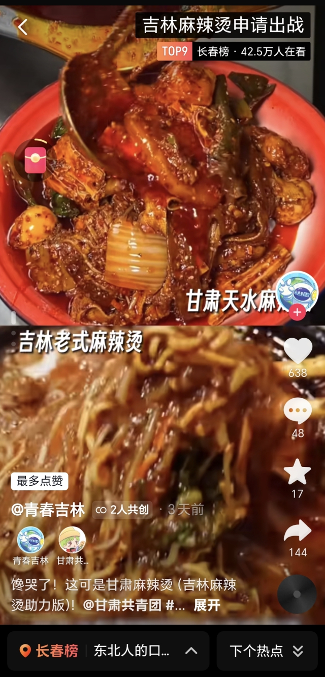 这么看来,东北三省的麻辣烫还是很能“打”。作为“全国第一”的吉林麻辣烫,被网友们津津乐道。尤其辽源麻辣烫热度最高,还有长春的麻辣烫、延吉的麻辣烫等都备受追捧。