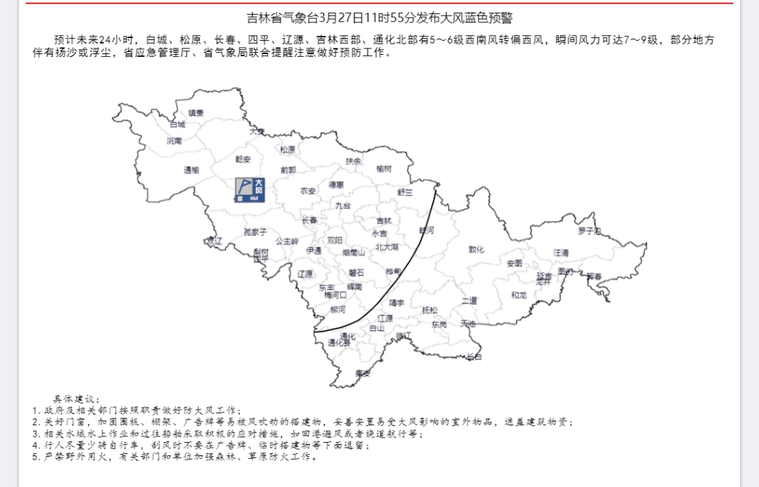 吉林省气象台3月27日11时55分发布大风蓝色预警:预计未来24小时,白城、松原、长春、四平、辽源、吉林西部、通化北部有5~6级西南风转偏西风,瞬间风力可达7~9级,部分地方伴有扬沙或浮尘,省应急管理厅、省气象局联合提醒注意做好预防工作。