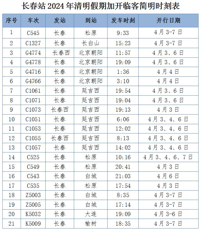 今年清明假期客流主要以短途流为主,主要集中在延吉、白城、大连、北京等方向。长春站研判客流变化,坚持“一日一图”,精准有序做好运力投放。计划加开松原、白城、延吉西、北京朝阳、榆树等方向临时旅客列车21列,全面做好运力准备,确保高峰时段运能运力充足。