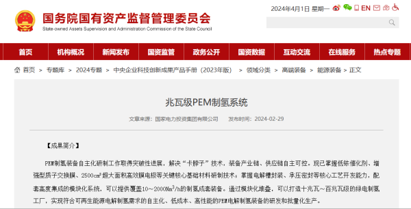 说来也很巧,就在这次采访的前两天,4月1日,国务院国资委公布了中央企业科技创新成果产品手册(2023年版),由国氢科技及其子公司长春绿动、武汉绿动共同研制的兆瓦级PEM制氢系统荣列其中。