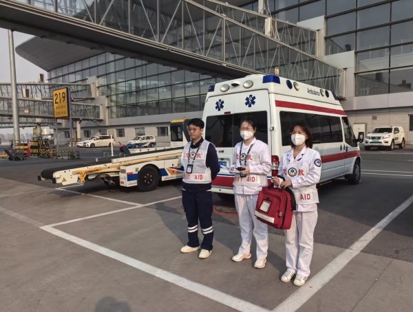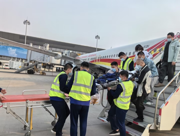 待患者转送至交接地点后,长春机场医护人员与担架队员协力将患者搬运至场外急救车辆内,安顿好重患并与场外医护人员进行了交接,患者家属对长春机场医护人员专业的医疗技术及耐心的服务态度表达了感激之情。