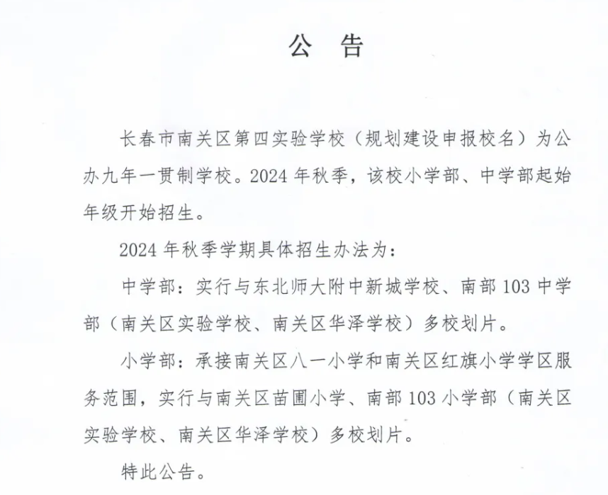 中国吉林网从长春市南关区教育局了解到,长春市南关区第四实验学校(规划建设申报校名)2024年秋季小学部、中学部起始年级开始招生。