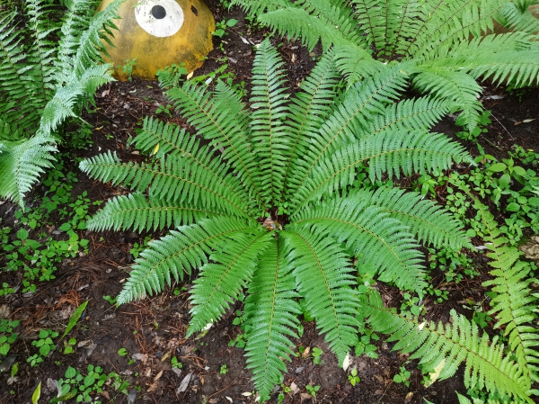 据介绍,这款林业“科研周边”是一枚由科研人员纯手工制作的蕨类植物的徽章。徽章中的这株蕨类植物名叫“粗茎鳞毛蕨”,它就是中药里大名鼎鼎的“贯众”的源植物。它也是长春市林科院科研团队,用三年时间完成的省级科研项目——“长白山观赏和药用蕨类植物引种繁育及高效栽培技术研究”中成功繁育的一种植物。目前这个项目的成果已经开始部分应用于长春城市绿化,市民可以在友谊公园、南湖公园、动植物公园、百木园等城市公园内看到这些蕨类植物。