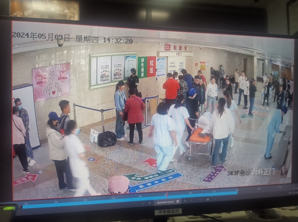 随后,这位女生突然浑身无力瘫倒在就诊大厅,三人迅速上前评估女生身体状况。见这位女生呼吸尚且正常,但意识不清,手脚抽搐,三位陪检员与分导诊刘永乐借来转运平车,一起将她护送到急诊内科抢救室。急诊医生诊断为低钾血症导致晕厥,救治及时,目前病情已经平稳,后续将对症给予积极治疗。