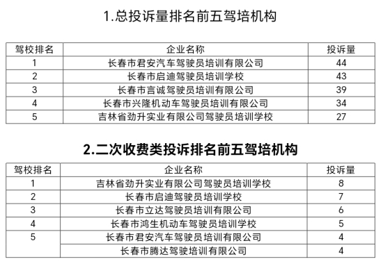 2024年4月份,长春市交通运输部门共受理各类涉及驾驶员培训行业投诉383件,现将部分投诉排名前5驾培机构公示如下: