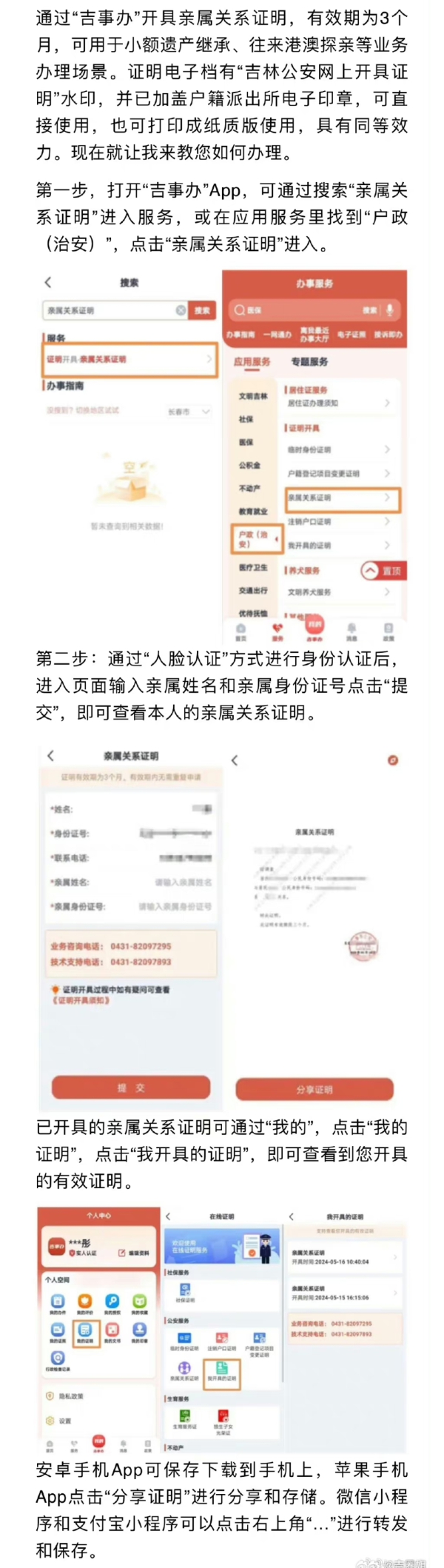 吉林省线下办理亲属关系证明需要到户籍地派出所,还要提交户口簿等申请材料。近日,“吉事办”现已推出亲属关系证明服务,用手机就能便捷办理。