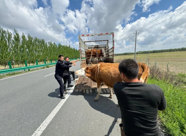 6月2日,吉林高速公安白城分局巡逻五大队民警在巡逻时发现两辆载牛货车停靠在应急车道内。