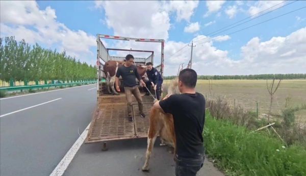 经民警与两位驾驶员商议后决定,先用绳子将牛固定,防止其进入高速公路行车道,再逐头将牛赶回车上。