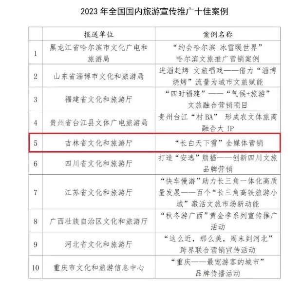 咱吉林省又获国家奖啦!吉林省文化和旅游厅“长白天下雪”全媒体营销,日前从全国140多个案例中脱颖而出,荣获国家文旅部“2023年全国旅游宣传推广十佳案例”。此次获奖的省厅级案例数量为6个,分别为福建、吉林、四川、江苏、广西、河北。