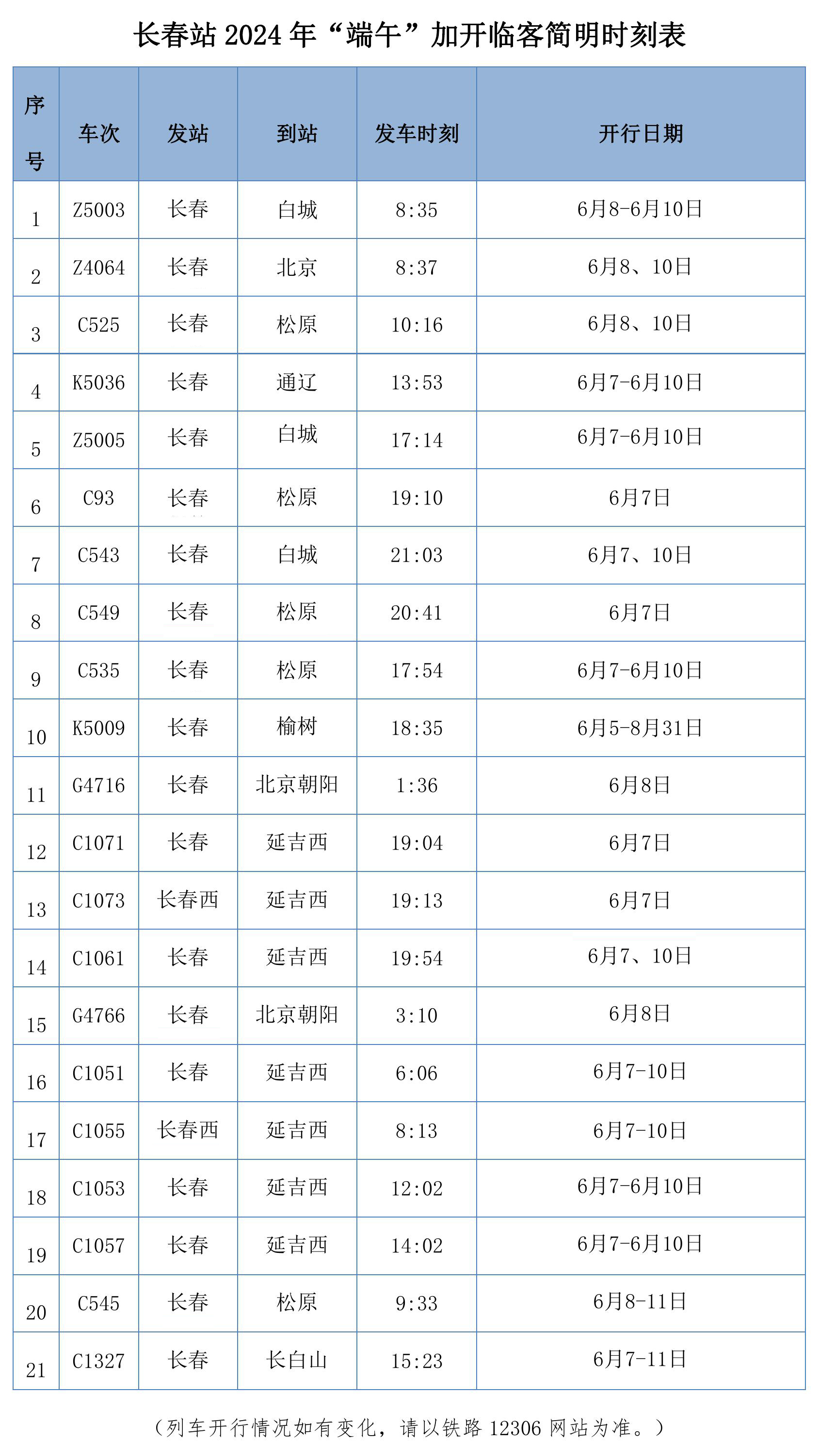 长春站2024年端午假期旅客运输组织工作自6月7日开始,至6月11日结束,共计5天。预计发送旅客55.7万人次,日均11.1万人次,较2023年同期增加1.7万人次,增幅3%。6月8日为高峰日,预计发送旅客14.8万人次。