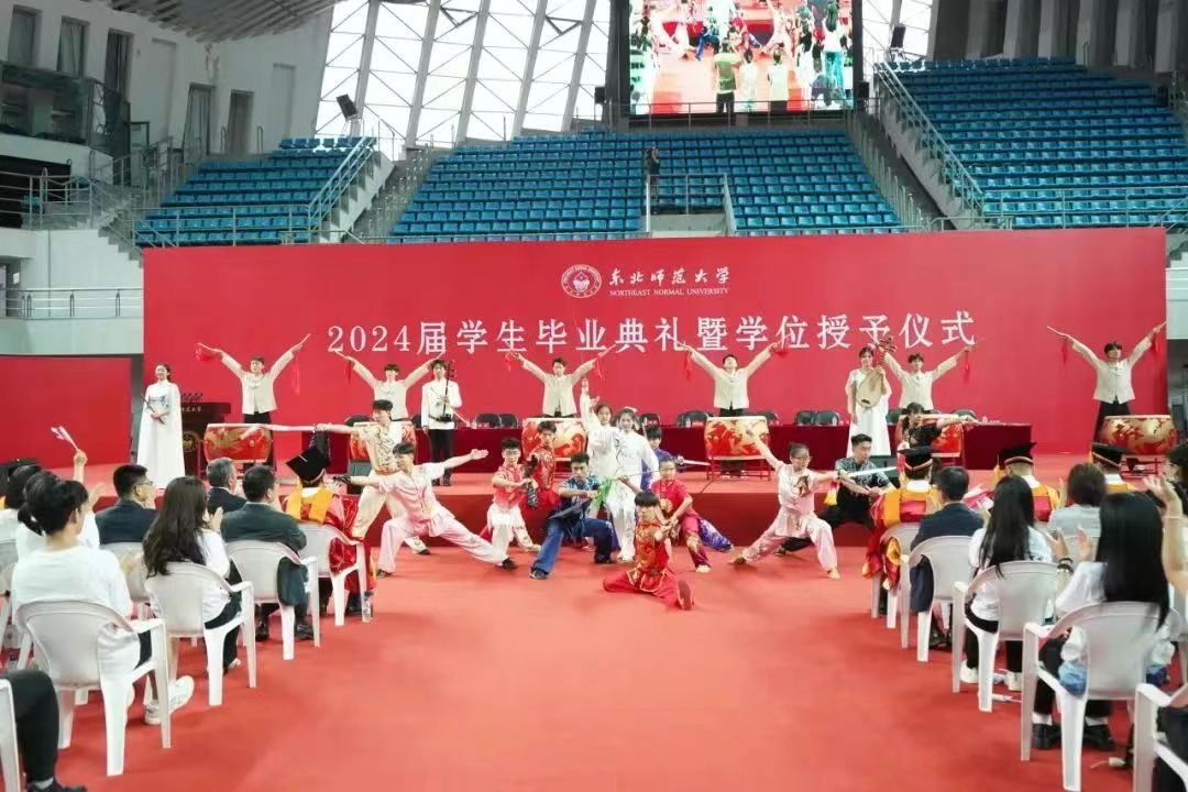 典礼开始前,音乐学院、体育学院师生倾情奉献了精彩的暖场武术、歌舞表演,毕业生们放声高歌,全场互动,气氛超燃,展现了东师学子蓬勃向上的青春力量。