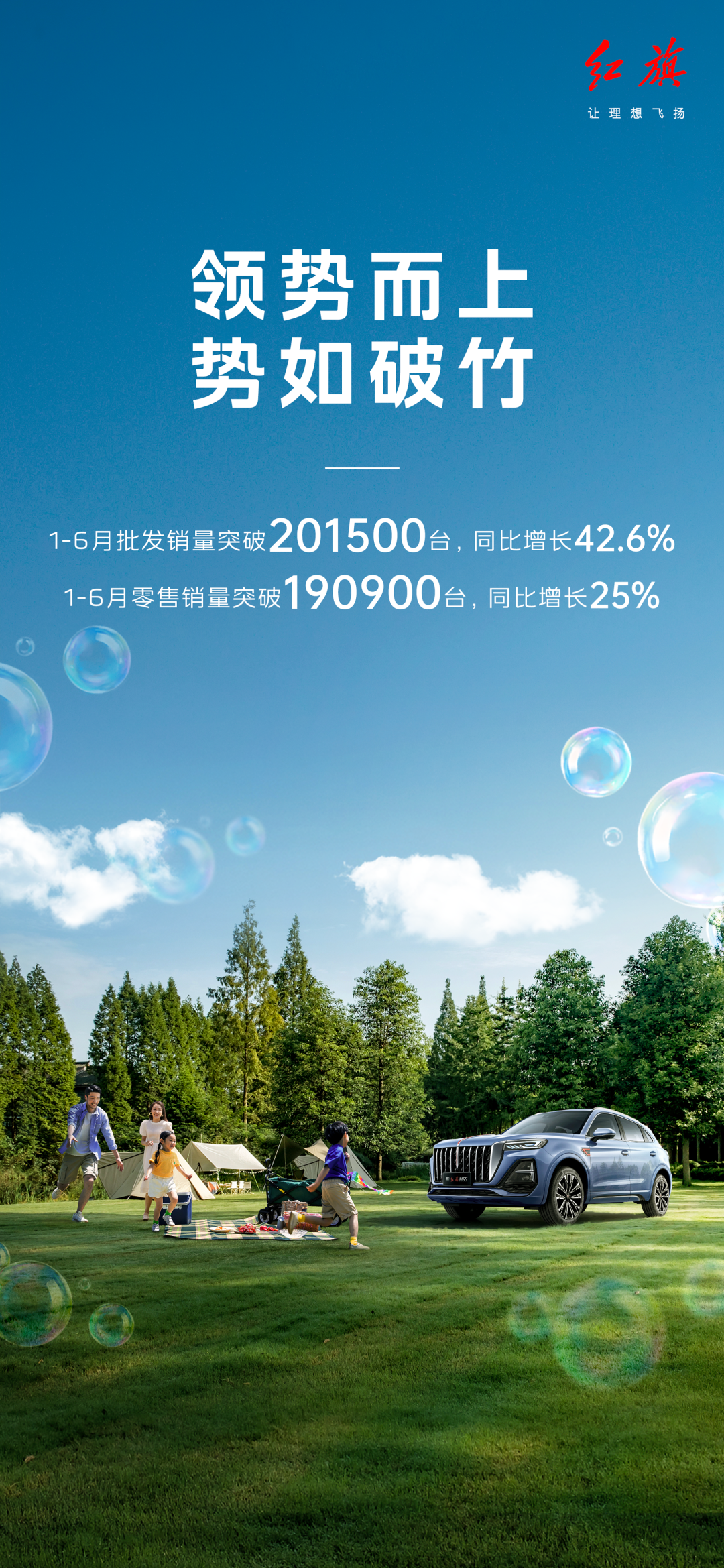 近日,中国一汽发布消息,2024年1月-6月一汽红旗批发销量突破201500台,同比增长42.6%;零售销量突破190900台,同比增长25%。
