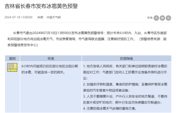 2024年07月18日13时00分,长春市气象台发布冰雹黄色预警信号:预计未来6小时内,九台、长春市区东南部和双阳部分地方将出现冰雹天气,市应急管理局、市气象局联合提醒,注意做好预防工作。