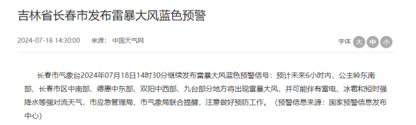 2024年07月18日14时30分,长春市气象台继续发布雷暴大风蓝色预警信号:预计未来6小时内,公主岭东南部、长春市区中南部、德惠中东部、双阳中西部、九台部分地方将出现雷暴大风,并可能伴有雷电、冰雹和短时强降水等强对流天气,市应急管理局、市气象局联合提醒,注意做好预防工作。