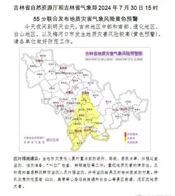 吉林省自然资源厅和吉林省气象局2024年7月30日15时55分联合发布地质灾害气象风险黄色预警:今天夜间到明天白天,吉林地区中部和南部、通化地区、白山地区,以及梅河口市发生地质灾害风险较高(黄色预警),请各单位做好防范工作。