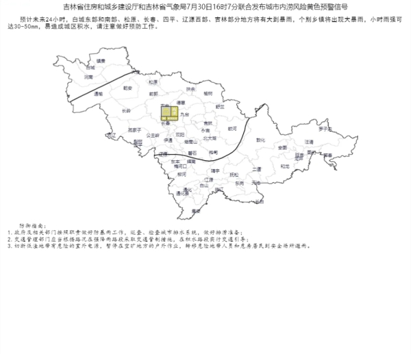 吉林省住房和城乡建设厅和吉林省气象局7月30日16时7分联合发布城市内涝风险黄色预警信号:预计未来24小时,白城东部和南部、松原、长春、四平、辽源西部、吉林部分地方将有大到暴雨,个别乡镇将出现大暴雨,小时雨强可达30-50mm,易造成城区积水,请注意做好预防工作。