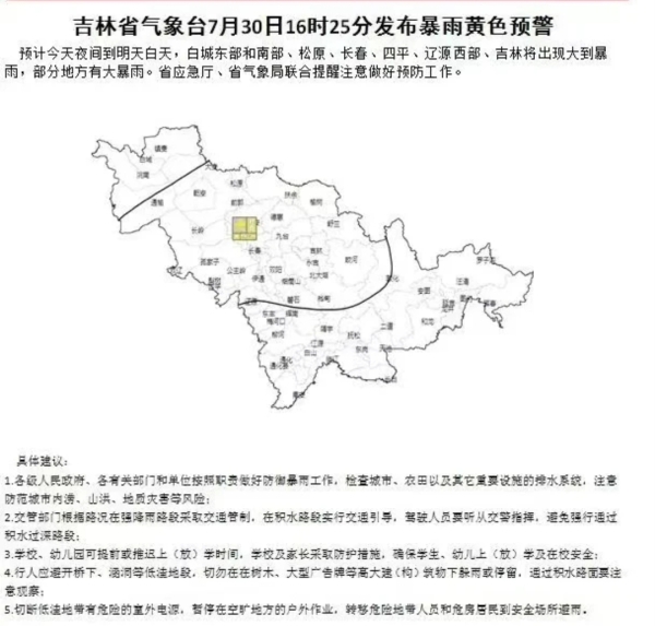 吉林省气象台7月30日16时25分发布暴雨黄色预警:预计今天夜间到明天白天,白城东部和南部、松原、长春、四平、辽源西部、吉林将出现大到暴雨,部分地方有大暴雨。省应急厅、省气象局联合提醒注意做好预防工作。