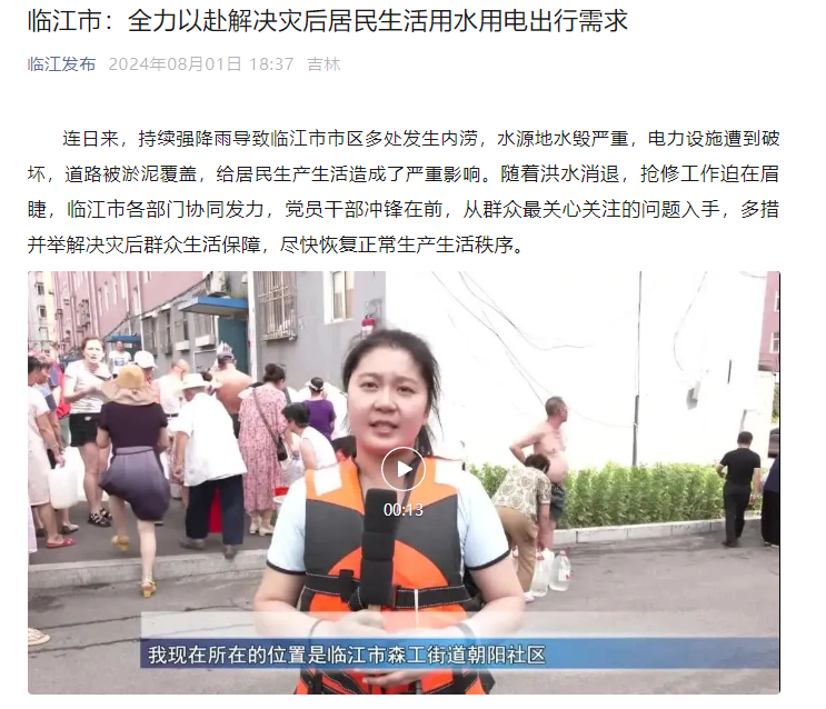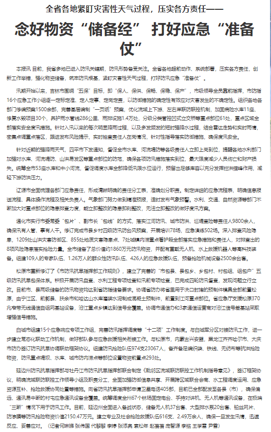 自7月27日,受台风“格美”外围水汽影响吉林省再次出现持续性大范围暴雨天气以来,时间已经过去了6天,吉林省各地各部门超前动作、系统部署,压实各方责任,创新工作举措,强化物资储备,筑牢防汛根基,紧盯灾害性天气过程,打好防汛“关键仗”。